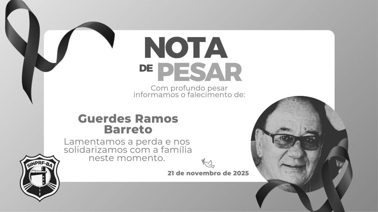 É com profundo pesar que o Sindicato dos Policiais Rodoviários Federais na Bahia (SINPRF/BA) comunica o falecimento do colega Guerdes Ramos Barreto, policial rodoviário federal aposentado, que atuou com dedicação e compromisso na Delegacia 10/09.