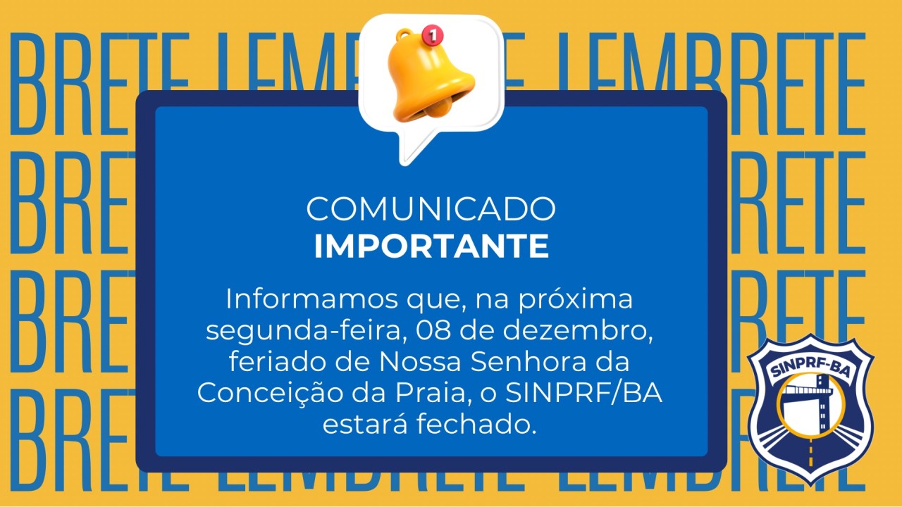 Em razão do feriado de Nossa Senhora da Conceição da Praia, informamos que o SINPRF/BA não funcionará na próxima segunda-feira, 08 de dezembro. As atividades serão retomadas normalmente na terça-feira 09/12. Desejamos a todos um feriado de paz e renovação.