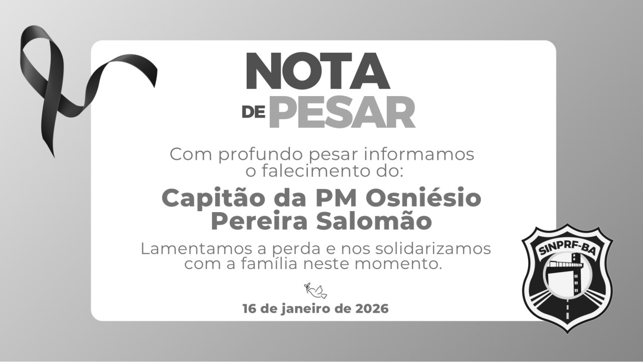 O Sindicato dos Policiais Rodoviários Federais na Bahia (SINPRF/BA) manifesta seu mais profundo pesar pelo falecimento do Capitão PM Osniésio Pereira Salomão, da Polícia Militar da Bahia, lotado na 18ª CIPM / Periperi.