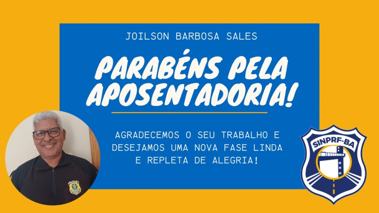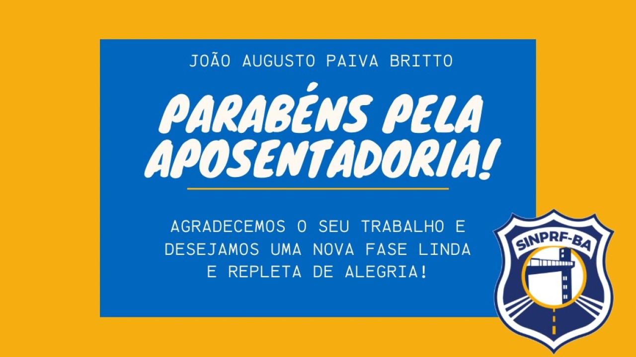 O Sindicato dos Policiais Rodoviários Federais na Bahia (SINPRF/BA) comunica a concessão de aposentadoria voluntária ao Policial Rodoviário Federal JOÃO AUGUSTO PAIVA BRITTO, integrante do Quadro de Pessoal da Polícia Rodoviária Federal, lotado na SPRF/BA.