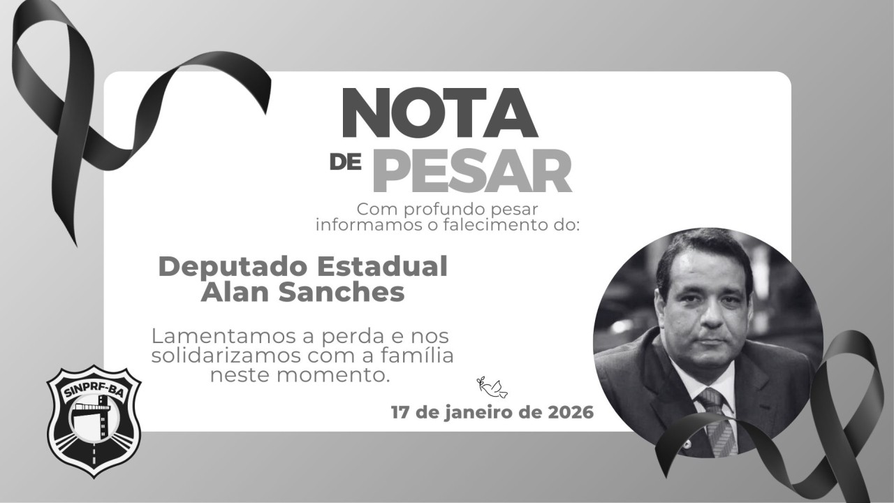 O Sindicato dos Policiais Rodoviários Federais na Bahia (SINPRF/BA) manifesta seu mais profundo pesar pelo falecimento do Deputado Estadual Alan Sanches, ocorrido no sábado (17/01), em Salvador.