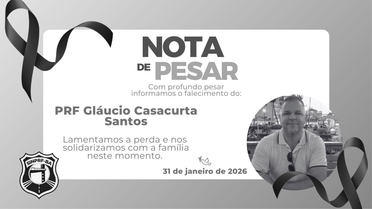 O SINPRF/BA lamenta profundamente o falecimento do policial rodoviário federal Gláucio Casacurta Santos, ocorrido em 31 de janeiro de 2026. Atualmente lotado no Estado de Roraima. Manifestamos nossa solidariedade aos familiares, amigos e colegas, desejando conforto neste momento de dor.
