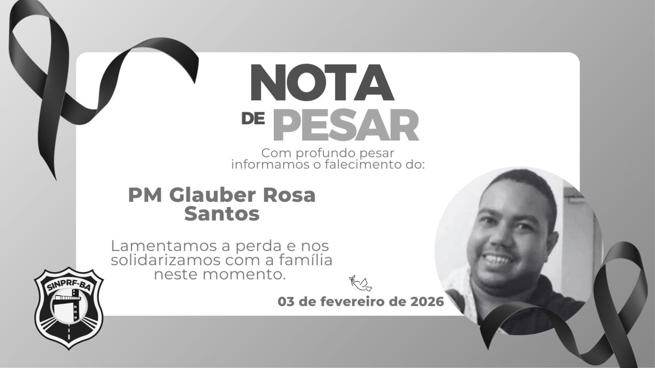 O Sindicato dos Policiais Rodoviários Federais na Bahia (SINPRF/BA) manifesta profundo pesar pelo falecimento do cabo da Polícia Militar da Bahia, Glauber Rosa Santos, ocorrido em decorrência de ferimento por arma de fogo durante ocorrência no bairro Vale das Pedrinhas, em Salvador.