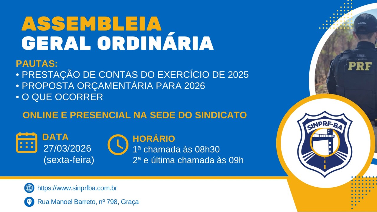 A PRESIDENTE do Sindicato dos Policiais Rodoviários Federais no Estado da Bahia – SINPRF/BA, no uso das atribuições conferidas pelo Estatuto da Entidade, no Título IV, Cap. I, Art. 20, Inciso XIII, Cap. II, Art. 23, §1o, considerando a Deliberação da Diretoria Executiva realizada em 17/04/2024, resolve: convocar Assembleia Geral Extraordinária, observada a seguinte pauta: I – Deliberar sobre o percentual de incidência da contribuição sindical e repasse a FENAPRF. |